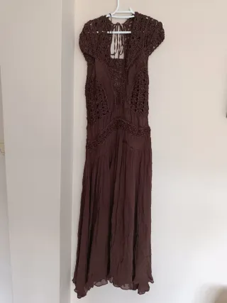 Vestido largo de la colección ZW Collection de Zara, con un diseño de crochet en la parte superior y falda fluida. Vestido largo confeccionado en hilo de viscosa. Escote redondo y manga corta. Detalle de aplique de ganchillo a juego. Cierre en la espalda con lazos. - Combinación de crochet y tejido. - Mangas cortas. - Espalda abierta Zara Talla M