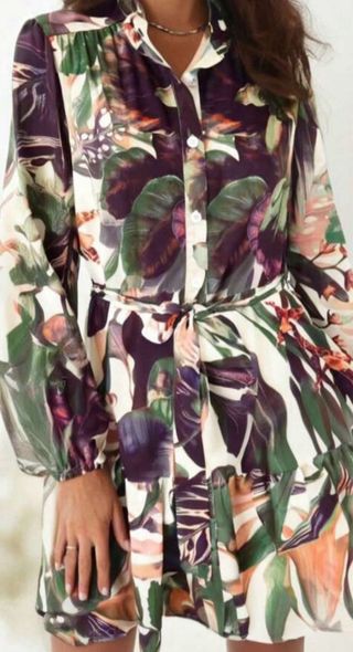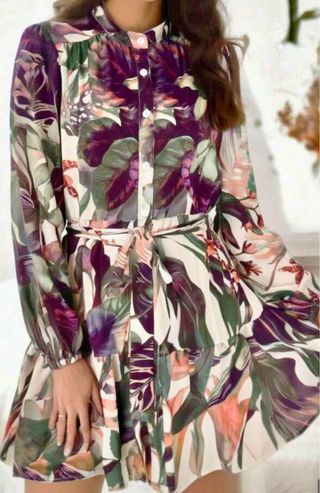 Elegante vestido con un estampado vibrante y un delicado volante. - Diseño con mangas largas. - Cinturón a juego para ajustar la silueta. - Cuello camisero con botones.