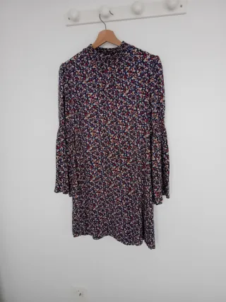 Vestido con un bonito estampado floral en tonos oscuros. - Manga larga acampanada. - Cuello alto. - Largo hasta la rodilla.