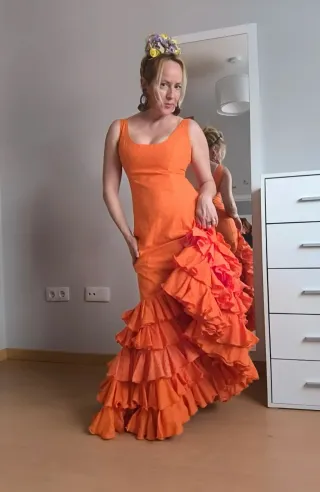 Vestido de flamenca con un vibrante color naranja y detalles de volantes. - Diseño largo y ajustado. - Múltiples volantes en la falda.