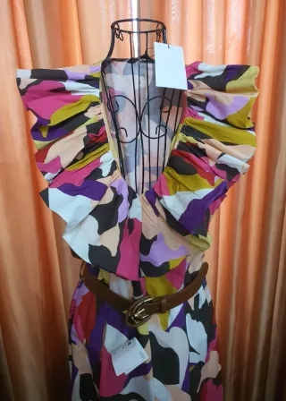 Vestido midi de Zara con un estampado vibrante y volantes. - Diseño con volantes en mangas y escote. - Cinturón marrón a juego. - Largo midi.