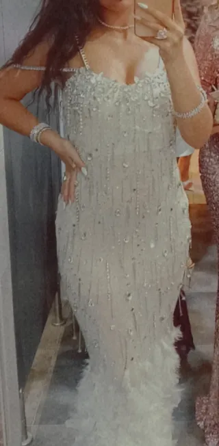 Vestido de fiesta largo, con detalles brillantes y plumas. Echo a mano talla 36/38 se da bastante porque lleva licra - Diseño con tirantes finos. - Adornado con pedrería y abalorios. - Bajo con detalle de plumas.