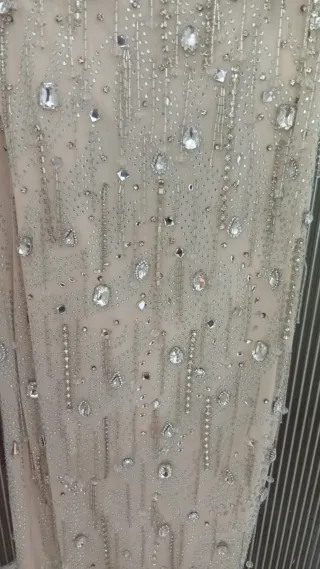 Elegante vestido de fiesta largo, con un diseño único y detalles brillantes. - Escote palabra de honor. - Adornado con pedrería y perlas. - Corte sirena que realza la figura. Lleva corsé y varillas , lleno de pedrería , da una 40/42 El forro interno es licra fuerte que moldea el cuerpo. Echo en modista.
