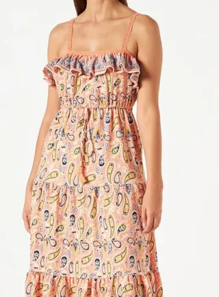 Vestido largo con un bonito estampado paisley. Presenta un diseño con volantes y tirantes de crochet. Cintura elástica con cinturón con borla. Está sin estrenar. - Diseño con volantes. - Tirantes de crochet. - Estampado paisley.