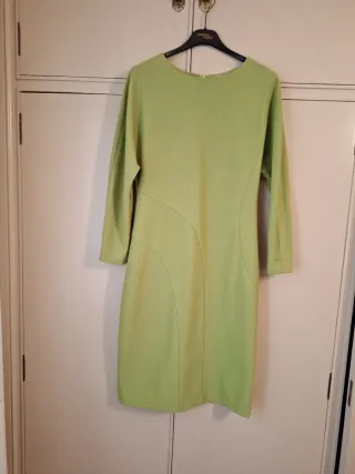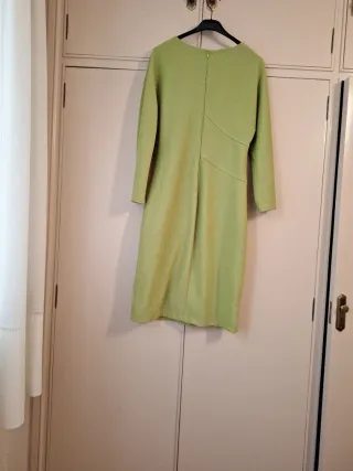 Traje entallado por la rodilla con chaqueta del mismo largo, el traje lleva cremallera detrás y abertura en la parte baja trasera, va totalmente forrado. La chaqueta tiene dos aberturas laterales y dos franjas caladas en la parte de delante con incrustación de brillantes entre medias, corte recto y tela brillante en solapa y mangas, color verde claro que no se aprecia bien en las fotos y talla 50, con buena caída y tela con brillo muy elegante.