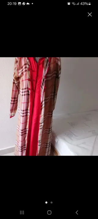 Precioso caftán tipo jelaba mlefa de calidad con un diseño de cuadros llamativo. Es una prenda elegante y versátil. Casi nuevo Son 2 piezas - Diseño de cuadros en tonos beige y rojo.