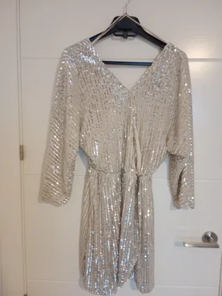 Elegante vestido corto con lentejuelas que aportan mucho brillo. - Diseño con escote en V. - Manga larga. - Cintura ceñida con cordón.