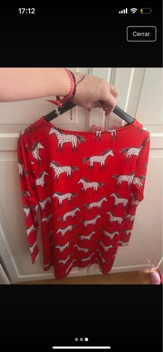 Vestido de manga larga con un divertido estampado de caballos sobre fondo rojo. - Diseño exclusivo de la marca Lolina. - Estampado de caballos blancos con puntos negros. - Cuello redondo. - Manga larga. vale como talla M