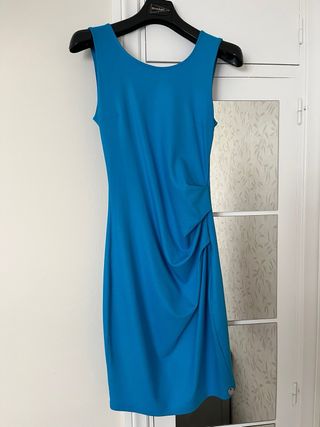 Vestido usado corto de corte ajustado, ideal para lucir un estilo juvenil y moderno. Su diseño es elegante y versátil. Ver fotos para ver talla. - Largo total: 83 cm. - Escote en V. - Sin mangas.
