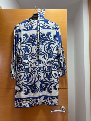 Vestido corto de Zara con un bonito estampado. - Diseño con escote en V. - Cierre de botones en la parte delantera. - Mangas largas abullonadas. - Detalle de lazada en la cintura.