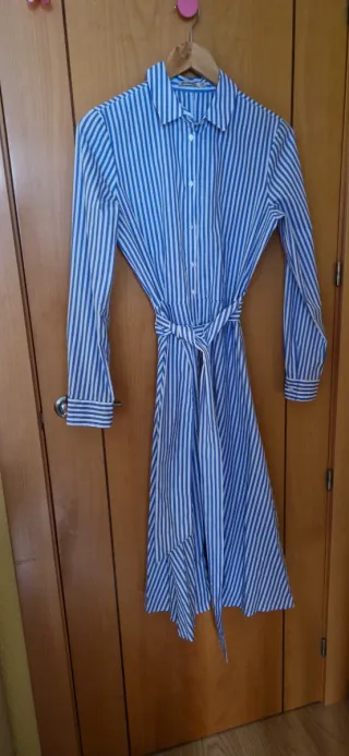 Vestido camisero con un diseño de rayas verticales azules y blancas. Presenta un cinturón para anudar a la cintura. - Cuello camisero. - Cierre de botones. - Manga larga.