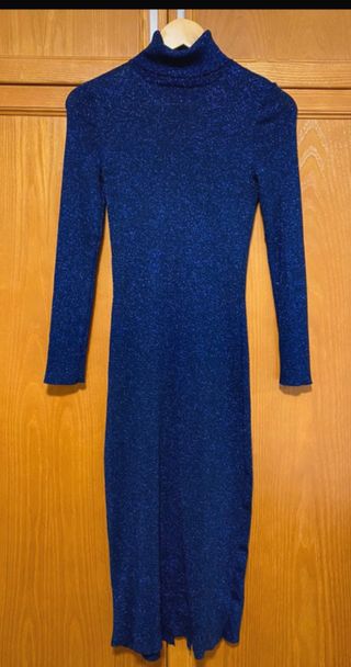 Vestido de punto midi con hilo metalizado en color azul. - Diseño de cuello cisne - Manga larga. - Largo midi. - Abertura trasera
