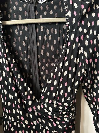 Vestido con estampado de lunares en tonos negro, rosa y blanco. Presenta un diseño cruzado en la parte delantera con drapeado. - Manga larga. - Cierre de cremallera en la espalda. - Escote pronunciado.