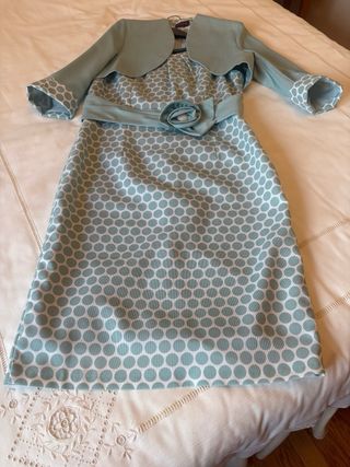 Elegante vestido de fiesta con estampado de lunares en tonos verdes y azul verdoso. Presenta un cinturón a juego anudado en la cintura. - Diseño sin mangas. - Cuello redondo con plisado. - Largo hasta la rodilla.