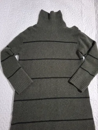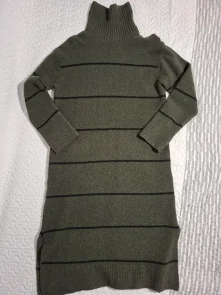 Vestido de punto de largo midi con un diseño a rayas. - Cuello alto tipo cisne. - Manga larga. - Bajo con aberturas laterales.