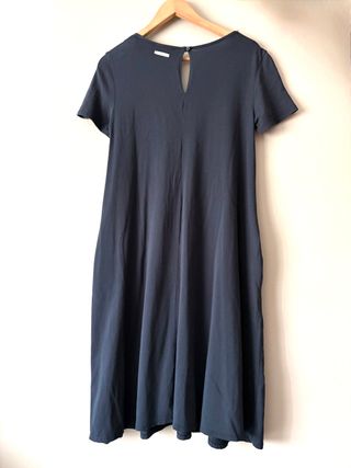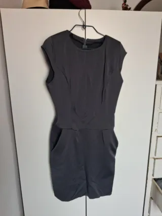 Vestido de corte recto y manga corta. - Cuello en V. - Bolsillos laterales. - Abertura en la espalda con botón. Estado impecable.