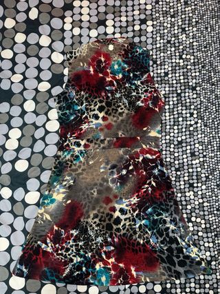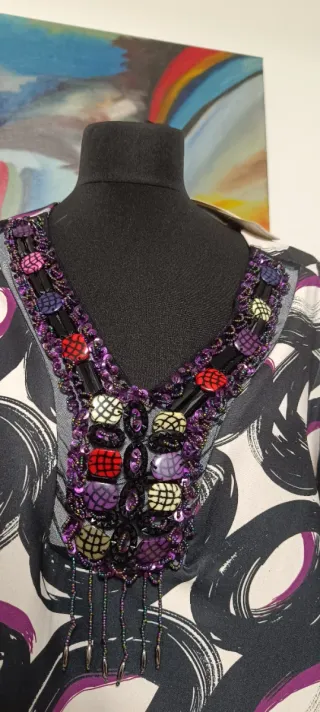 Vestido de talla L con un diseño vibrante y detalles bordados. - Diseño multicolor con predominio del morado. - Adornos de pedrería y abalorios en el cuello. - Estampado de círculos en blanco y negro.