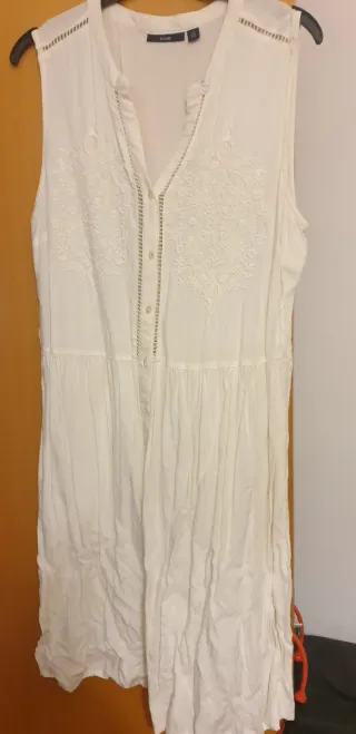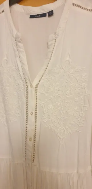 Vestido de verano de la marca Kiabi. Diseño fresco y ligero, ideal para días cálidos. - Escote en V con botones. - Detalle de bordado en la parte delantera. - Mangas cortas. - Falda con vuelo y textura.