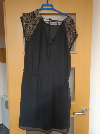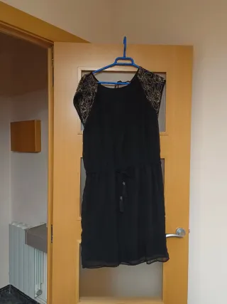 Elegante vestido negro con detalles decorativos. - Mangas cortas con bordado dorado. - Cintura ajustable con cordón y borlas. - Tejido ligero y fluido.