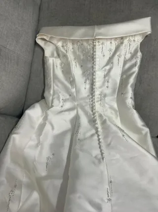 Elegante vestido de novia de la marca Raimon Bundo. - Diseño con escote pronunciado. - Cintura adornada con detalles. - Falda con caída y bordados. - Color blanco roto - Se regalan cancán y medias