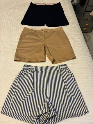 Conjunto de tres pantalones cortos de vestir.PRECIO DEL LOTE - Pantalón corto azul marino. - Pantalón corto color camel. - Pantalón corto de rayas azul marino y blanco.