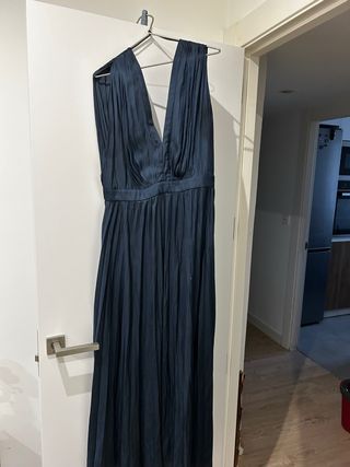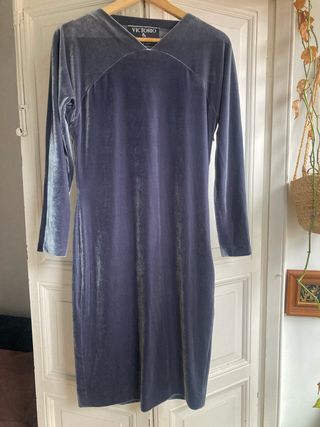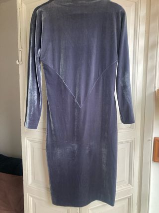Elegante vestido de terciopelo gris petroleo. El color es muy bonito aunque en las fotos no se refleja. Tiene cremallera en un lateral porque es ajustado. Pone que es la talla 46 pero para mí es más una 38-40 porque me viene pequeño. - Manga larga. - Cuello en pico. - Corte recto.