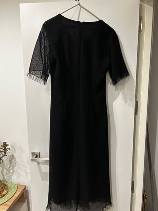 Elegante vestido negro con detalle de encaje. - Diseño de manga corta. - Cintura marcada y falda con vuelo. - Bajo con acabado festoneado.