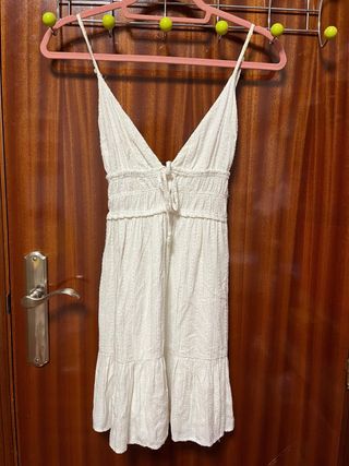 Vestido blanco de tirantes con escote en V y detalle de lazada. - Cuerpo fruncido. - Falda con vuelo y volantes. - Tejido con textura.