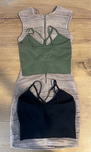 Conjunto de vestido y dos crop tops de la marca Guess. El vestido es ajustado y tiene un diseño con detalles de rayas caladas y cremallera trasera. Los crop tops son de tirantes finos. - Vestido ajustado con cremallera. - Dos crop tops incluidos color verde oliva y negro.