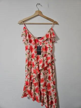 Vestido con estampado floral vibrante. Presenta un diseño con volantes y tirantes finos. - Escote en V. - Volantes asimétricos. - Bajo irregular.