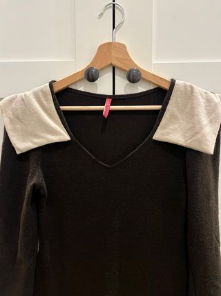 Original y sencillo vestido LACHULA mujer. Vestido corto, es de punto fino de color marrón oscuro, con originales solapas en los hombros de color beige. Es de punto liso, recto,pero se pega al cuerpo. Es muy original puesto con medias y bota alta. Talla S/M ( Medidas Largo 80, Ancho 38, Manga 53 y Hombros 35cm, aproximadamente) Usado pero en condiciones aceptables( al ser punto fino puede tener alguna bolita, pero al ser marrón oscuro no se notan). Descuento a partir del segundo artículo