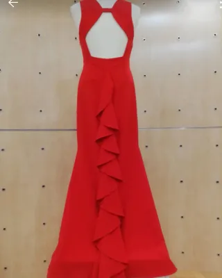 Elegante vestido largo de color rojo. Su diseño es sofisticado y moderno. - Corte sirena. - Escote redondo. - Sin mangas. - Usado únicamente dos veces.