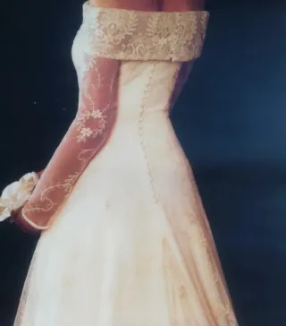 Elegante vestido de novia de estilo vintage, con un delicado encaje que le da un toque romántico. - Diseño de manga larga. - Corte sirena. - Detalle de lazo en la cintura.