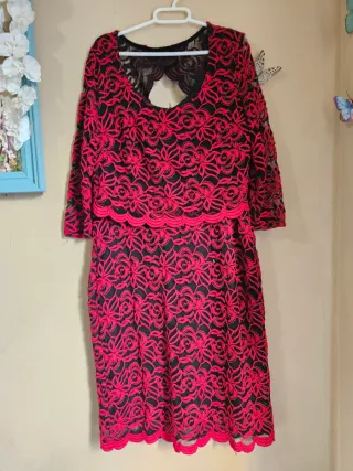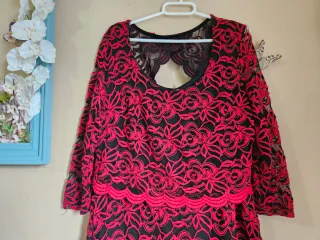 Elegante vestido de cóctel con un diseño de encaje. - Combinación de colores negro y rojo. - Detalle de encaje floral. - Escote con detalle de encaje. - Manga larga. - Bajo con acabado festoneado.