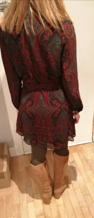 Vestido de Zara con un estampado llamativo. - Diseño con cuello alto y manga larga. - Cinturón a juego para ajustar la cintura. - Detalle de bordado en el cuello y puños.