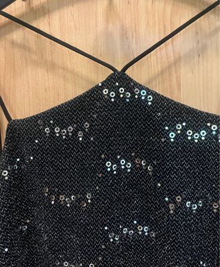 Vestido corto con mucho brillo, ideal para eventos especiales. - Diseño con lentejuelas. - Tirantes finos cruzados en la espalda. - Corte recto.