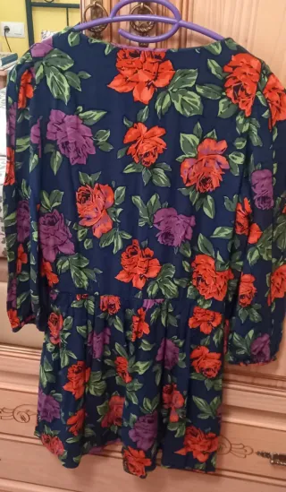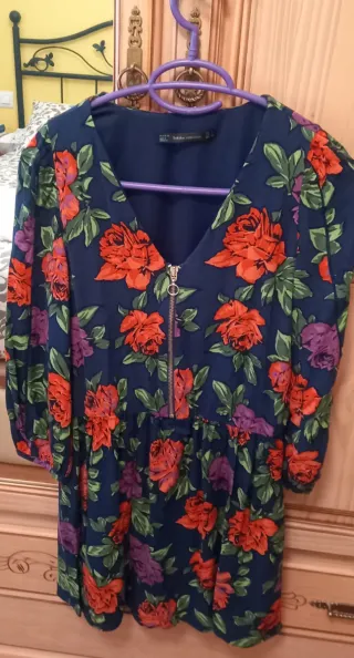 Vestido de Zara con un llamativo estampado floral. - Diseño con cremallera frontal. - Mangas largas abullonadas. - Estampado de rosas rojas y moradas sobre fondo azul marino. - Talla S. Muy poco uso