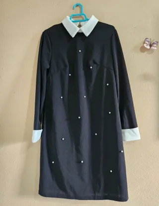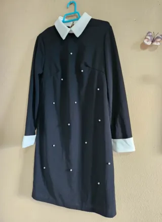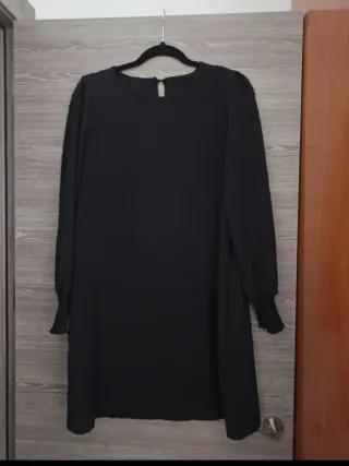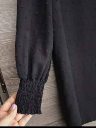 Vestido elegante con un diseño de topos negros. - Manga larga. - Cuello redondo. - Puños elásticos. Sin usar en perfectas condiciones