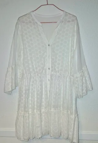 Vestido blanco con detalles bordados y volantes. - Diseño con escote en V y botones. - Mangas acampanadas con volantes. - Cintura elástica Solo tiene una pequeñita mancha (secunda foto)