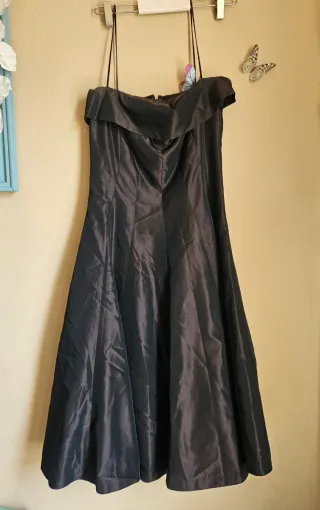 Elegante vestido negro con detalles de encaje y falda plisada. - Cuerpo superior de tejido semitransparente con aplicaciones de encaje en los laterales. - Cintura marcada con banda de encaje. - Falda con pliegues y textura. - Diseño sin mangas. - Solo se ha usado una vez