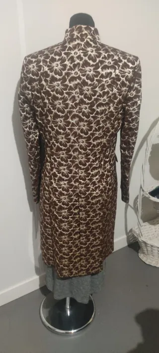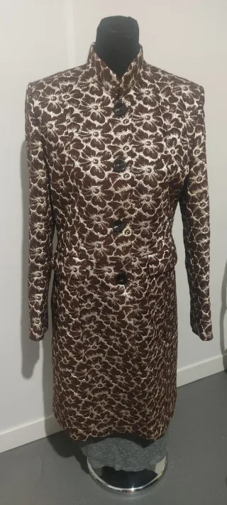 Elegante abrigo de vestir con un estampado floral. - Diseño de cuello alto. - Cierre de botones. - Mangas largas. Medidas Largo 97 Contorno de pecho 104 Largo manga 59