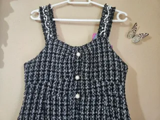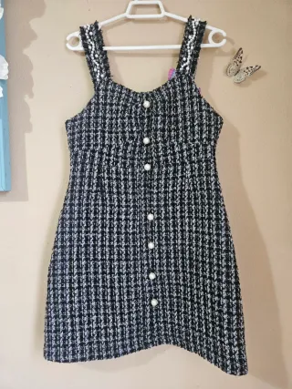Vestido corto de tweed con detalle de perlas en los tirantes y botones. - Diseño a cuadros. - Tirantes con adornos de perlas. - Cierre de botones nacarados.