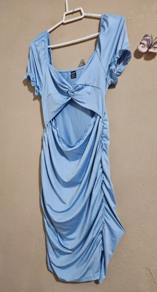 Elegante vestido largo de la marca FEVERSAVE en un vibrante color azul. Sin estrenar. Ideal para eventos. - Diseño con escote pronunciado. - Detalle de drapeado y nudo en la cintura. - Mangas tres cuartos. - Corte asimétrico en la falda.