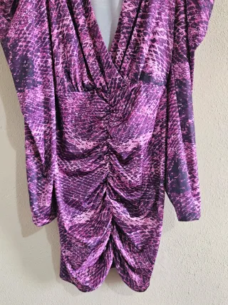 Elegante vestido de seda con estampado de cebra. - Diseño drapeado. - Detalle de lazada en el hombro. - Largo midi. Usado en una única ocasión. Es más una 44 que una 46. Da poca talla. 94% seda y 4% elastano.