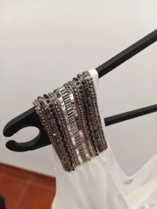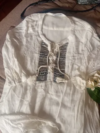 Vestido blanco de Mango suit tipo tunica con detalles bordados y cordones. -vestido tipo gasa tela fluida y forro interior - Diseño con escote en V. - Adornos de pedrería y abalorios en plateado y gria - Cordones con borlas decorativas.