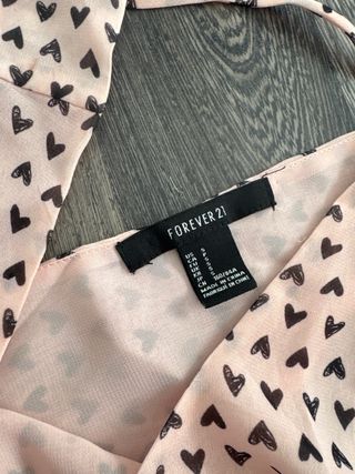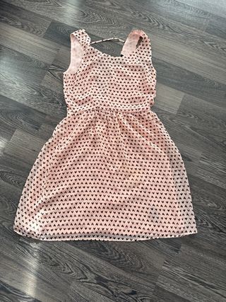 Precioso y delicado vestido rosa con corazones, en perfecto estado. Con la espalda al aire y un lacito en la parte baja de la espalda. Lleva cremallera oculta en el lateral izquierdo. Marca una talla S, pero da poca talla, por lo que equivale a una XS. 100% poliéster