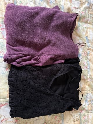 Conjunto de dos vestidos, uno negro y otro morado. El vestido negro es de encaje y el morado tiene un acabado texturizado. - Vestido negro con detalle de encaje. De lefties talla M - Vestido morado con textura. Bershka talla S