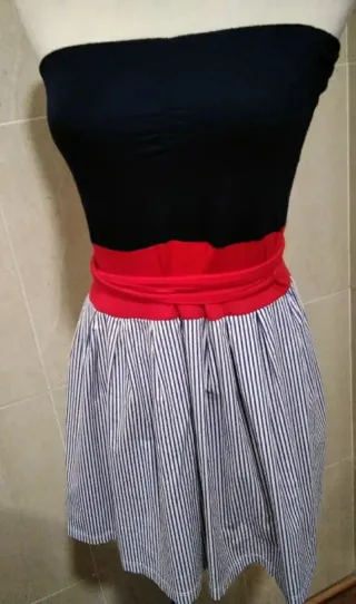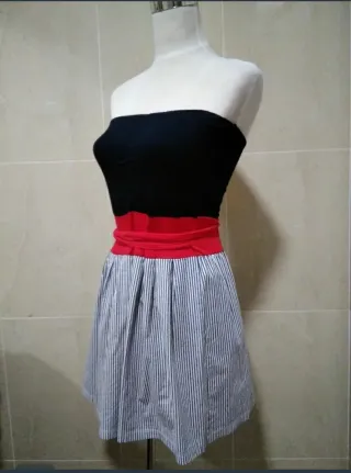 Vestido estilo Dolce Vita con un diseño moderno y juvenil. Talla M/L. - Parte superior tipo strapless, palabra de honor, lazada a modo de cinturón o fajín en color rojo, falda con estampado de rayas verticales en blanco y azul. #vestido #vestidopalabradehonor #vestidomini #vestidoverano #vestidoocasiones #vestidococktel #vestidosespeciales #vestidojuvenil #vestidos