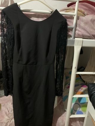Elegante vestido negro con mangas de encaje. - Diseño de manga larga. - Detalle de encaje en las mangas.