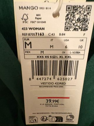 Vestido de la marca Mango, con etiqueta. - Talla M (EUR M, IT M, USA 6, UK 10). - Modelo: VESTIDO 423RED. - Referencia: 87057163. - Precio recomendado: 39,99€.